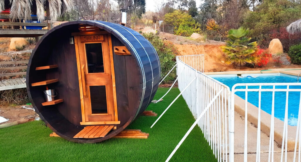 Saunas tipo tonel fabricados en madera de álamo, diseñados para alcanzar hasta 80°C y brindar una experiencia de bienestar completa en tu hogar o proyecto turístico.
